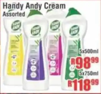 This special is available in various stores, view all products to get the cheapest Handy Andy Cream Assorted. If you'd like to find out whether this product has a bigger discount in another store, check the category 'Wholesale'. You may also find these specials interesting: Handy Andy All Purpose Cream Assorted, Handy Andy All Purpose Cream Assorted-750ml Each & Handy Andy All Purpose Cream Cleaner Assorted 750ml.