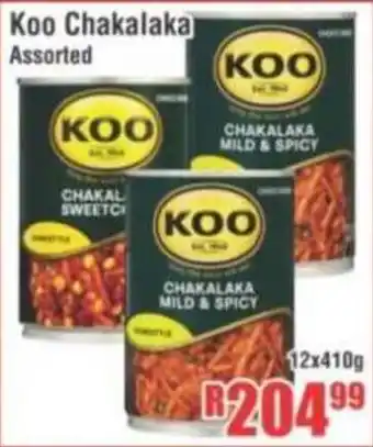 This special is available in various stores, view all products to get the cheapest Koo Chakalaka Assorted. If you'd like to find out whether this product has a bigger discount in another store, check the category 'Wholesale'. You may also find these specials interesting: KOO Chakalaka Assorted, KOO Chakalaka Assorted & KOO Chakalaka 410 g Assorted.
