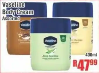 This special is available in various stores, view all products to get the cheapest Vaseline Body Cream Assorted. If you'd like to find out whether this product has a bigger discount in another store, check the category 'Wholesale'. You may also find these specials interesting: Vaseline Body Lotion Or Cream For Male Or Female (Incl. Argain Oil) Assorted 400ml-Each, Vaseline Body Cream or Lotion & Vaseline Body Lotion or Body Cream For Men or Women Asstd..