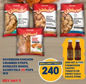 Sovereign chicken crumbed strips, boneless wings, schnitzels or pops promotion at Econo Foods