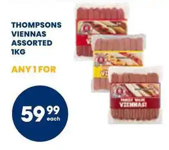 This special is available in various stores, view all products to get the cheapest Thompsons viennas assorted. If you'd like to find out whether this product has a bigger discount in another store, check the category 'Grocery stores'. You may also find these specials interesting: THOMPSONS VIENNAS 1kg each, Thompsons family value chicken viennas & MAMA'S Viennas Assorted.