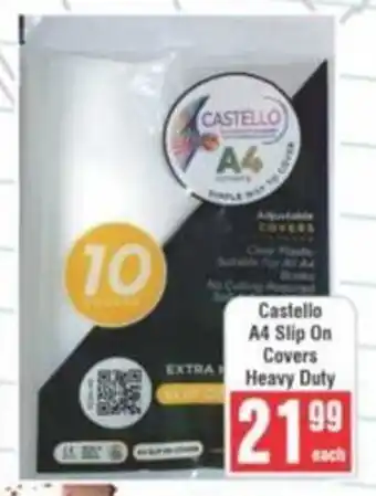 This special is available in various stores, view all products to get the cheapest Castello A4 Slip On Covers Heavy Duty. If you'd like to find out whether this product has a bigger discount in another store, check the category 'Grocery stores'. You may also find these specials interesting: Castello A4 Slip On Covers Medium Duty, Bantex A4 Slip On Heavy Duty PVC Covers & JIFFY A4 HEAVY-DUTY SLIP-ON PLASTIC BOOK COVERS.