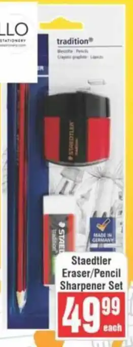 This special is available in various stores, view all products to get the cheapest Staedtler Eraser/ Pencil Sharpener Set. If you'd like to find out whether this product has a bigger discount in another store, check the category 'Grocery stores'. You may also find these specials interesting: Staedtler Tradition Set Pencil, Eraser and Sharpener, Staedtler Tradition HB Pencil, Eraser and Double-Hole Sharpener Set & Staedtler Eraser Sharpener Set.