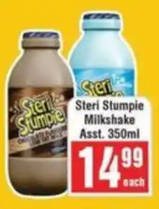 This special is available in various stores, view all products to get the cheapest Steri Stumpie Milkshake. If you'd like to find out whether this product has a bigger discount in another store, check the category 'Grocery stores'. You may also find these specials interesting: Steri Stumpie, Parmalat Steri Stumpie & Steri Stumpie Flavoured Milk.