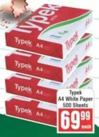 This special is available in various stores, view all products to get the cheapest Typek A4 White Paper 500 Sheets. If you'd like to find out whether this product has a bigger discount in another store, check the category 'Grocery stores'. You may also find these specials interesting: Typek A4 Ream Paper 500 Sheets, Typek A4 Photostat 80GSM Paper 250 Sheets & Typek A4 Photostat 80gsm Paper 500 Sheets.
