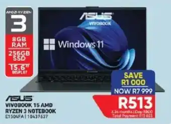 This special is available in various stores, view all products to get the cheapest Asus vivobook 15 amd ryzen 3 notebook. If you'd like to find out whether this product has a bigger discount in another store, check the category 'Home furniture'. You may also find these specials interesting: ASUS VivoBook M1407 AMD Ryzen AI 5 Laptop, ASUS Vivobook S14 AMD Ryzen AI 7 Laptop & ASUS VivoBook M1407 AMD Ryzen AI 7 Laptop.