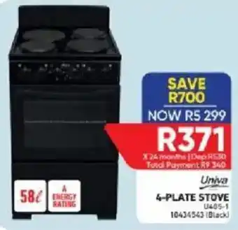 This special is available in various stores, view all products to get the cheapest Univa 4-plate stove. If you'd like to find out whether this product has a bigger discount in another store, check the category 'Home furniture'. You may also find these specials interesting: Univa 4 Plate Stove U405 21-475, Univa 3 Plate Stove U305 21-474 & Univa 4 Plate U405 Stove 21-475.