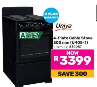 This special is available in various stores, view all products to get the cheapest 4-Plate Cable Stove 500 mm (U405-1). If you'd like to find out whether this product has a bigger discount in another store, check the category 'Department Stores'. You may also find these specials interesting: Univa 4 Plate Cable Stove 500mm U405-1 830087, Univa 3 Plate Stove U305 21-474 & Univa 4 Plate U405 Stove 21-475.