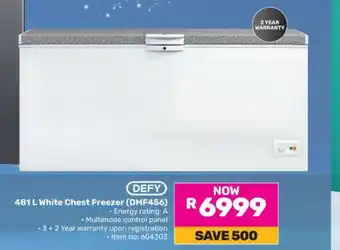 This special is available in various stores, view all products to get the cheapest 481 L White Chest Freezer (DMF456). If you'd like to find out whether this product has a bigger discount in another store, check the category 'Department Stores'. You may also find these specials interesting: DEFY 195 L Chest Freezer White (DMF470), Defy 254L White Chest Freezer DMF473 10018951 & Defy 195L White Chest Freezer DMF470 10016010.