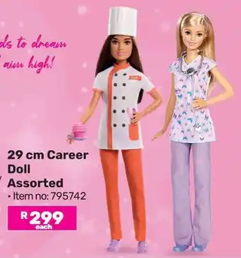 This special is available in various stores, view all products to get the cheapest Barbie Career Doll Assorted. If you'd like to find out whether this product has a bigger discount in another store, check the category 'Department Stores'. You may also find these specials interesting: Barbie 29cm Career Doll Assorted-Each, Barbie 29cm Career Doll Assorted-Each & 29 cm Career Doll Assorted.