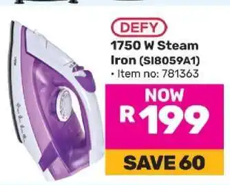 This special is available in various stores, view all products to get the cheapest DEFY 1750 W Steam Iron (SI8059A1). If you'd like to find out whether this product has a bigger discount in another store, check the category 'Department Stores'. You may also find these specials interesting: Defy 1750W Steam Iron SI8059A1 781363, Defy Steam Iron 2200w & Defy Steam Iron 1750w.