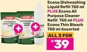 Econo Dishwashing Liquid Refill 750ml+All Purpose Cleaner Refill 750ml+Thin Bleach 750ml-For 3 Offer at Game