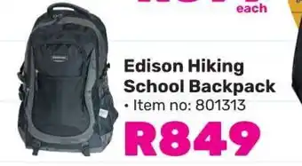 This special is available in various stores, view all products to get the cheapest Edison Hiking School Backpack. If you'd like to find out whether this product has a bigger discount in another store, check the category 'Department Stores'. You may also find these specials interesting: Edison Hiking School Backpack 801313, Edison Hiking Or School Backpacks 801313-Each & EDISON School Backpack.