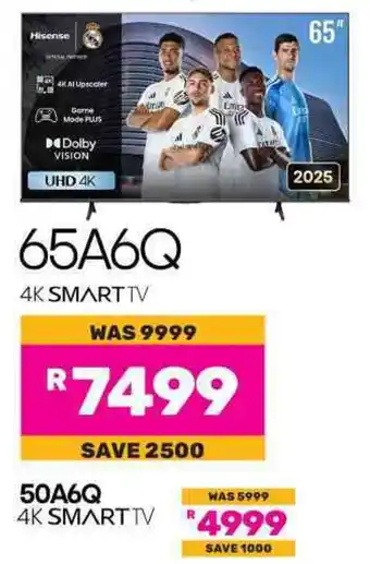 Game offers a wide collection of products, besides the Hisense 65" UHD 4K Smart TV. Keep an eye on the weekly Game catalogue to find the best specials and promotions. Besides Hisense 65" UHD 4K Smart TV, you can also find the following offers: Hisense 75" UHD 4K Smart TV, Hisense 50 Smart 4K UHD TV 50A6Q (10304030) & Hisense 58 UHD Smart TV (58A6N).