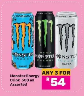 This special is available in various stores, view all products to get the cheapest Monster Energy Drink 500 ml Assorted. If you'd like to find out whether this product has a bigger discount in another store, check the category 'Department Stores'. You may also find these specials interesting: Monster Energy Drink Assorted 500ml, Monster Energy Drink Assorted 500ml & Monster Energy Drink Assorted.