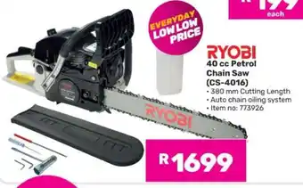 This special is available in various stores, view all products to get the cheapest RYOBI 40 cc Petrol Chain Saw (CS-4016). If you'd like to find out whether this product has a bigger discount in another store, check the category 'Department Stores'. You may also find these specials interesting: RYOBI 45 cc Petrol Chain Saw, Ryobi 40cc Petrol Chain Saw CS-4016 & Ryobi Chain Saw 40cc Petrol.
