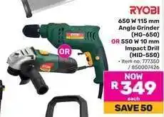 RYOBI 650 W 115 mm Angle Grinder (HG-650) OR 550 W 10 mm Impact Drill (HID-550) Offer at Game