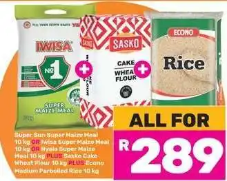 Super Sun Super Maize Meal, Sasko Cake Wheat Flour, Econo Medium Parboiled Rice