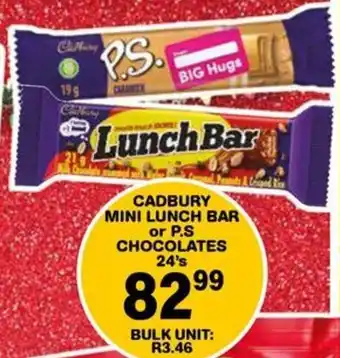 This special is available in various stores, view all products to get the cheapest Cadbury mini lunch bar or p.s chocolates. If you'd like to find out whether this product has a bigger discount in another store, check the category 'Grocery stores'. You may also find these specials interesting: CADBURY Lunch Bar, P.S., Crunchie, Astros or 5Star, CADBURY Lunch Bar, P.S., Crunchie, Astros or 5Star & Cadbury Lunch Bar Max/ P.S. Duo Chocolate Bar.