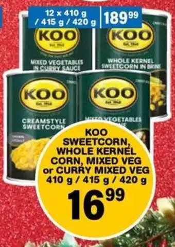 This special is available in various stores, view all products to get the cheapest Koo sweetcorn, whole kernel corn, mixed veg or curry mixed veg. If you'd like to find out whether this product has a bigger discount in another store, check the category 'Grocery stores'. You may also find these specials interesting: Koo sweet corn, peas, vegetable curry, whole kernel, mix veg, McCain Mixed Veg/ Sweetcorn/ Garden Peas & Koo Whole Kernel Corn/Creamstyle Sweetcorn.