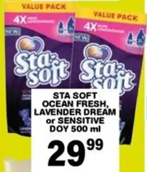 This special is available in various stores, view all products to get the cheapest Sta soft ocean fresh, lavender dream or sensitive doy. If you'd like to find out whether this product has a bigger discount in another store, check the category 'Grocery stores'. You may also find these specials interesting: Sta-soft Summer/ Lavender Fresh Fabric Conditioner, Sta soft baby, lavender or spring fresh refill pouch & Handy Andy Ocean/ Lavender Fresh Floor & All Purpose Cleaner With Domestos.