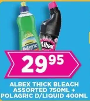 This special is available in various stores, view all products to get the cheapest Albex thick bleach assorted + polagric diswashing liquid. If you'd like to find out whether this product has a bigger discount in another store, check the category 'Grocery stores'. You may also find these specials interesting: ALBEX THICK BLEACH, W.LAB DISHWASH LIQUID OR THICK BLEACH & Albex thin bleach.