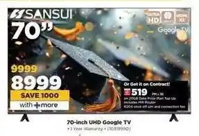 This special is available in various stores, view all products to get the cheapest 70-inch UHD Google TV. If you'd like to find out whether this product has a bigger discount in another store, check the category 'Department Stores'. You may also find these specials interesting: Sansui 65-inch UHD Google TV, Sansui 85-inch UHD Google TV & Sansui 70-inch UHD Google TV.