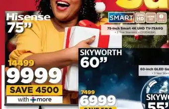 The price of Hisense 75 can be found at the top of the page, together with the dates during which the special is available. You can also check the price in the current HiFi Corp catalogue or on the HiFi Corp website. Promotional offers assure you of buying HiFi Corp products at the lowest price.