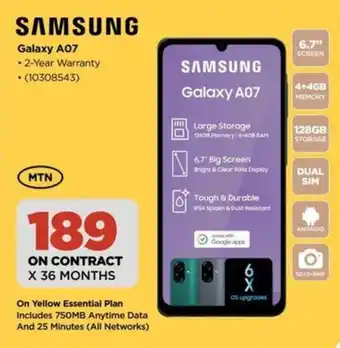 This special is available in various stores, view all products to get the cheapest Samsung Galaxy A07. If you'd like to find out whether this product has a bigger discount in another store, check the category 'Department Stores'. You may also find these specials interesting: Samsung Galaxy A36 5G, Samsung Galaxy A07 & Samsung Galaxy A26 5G.