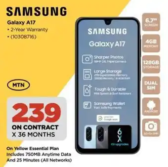 This special is available in various stores, view all products to get the cheapest Samsung Galaxy A17. If you'd like to find out whether this product has a bigger discount in another store, check the category 'Department Stores'. You may also find these specials interesting: Samsung Galaxy A36 5G, Samsung Galaxy A07 & Samsung Galaxy A26 5G.