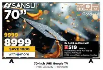 This special is available in various stores, view all products to get the cheapest Sansui 70-inch UHD Google TV. If you'd like to find out whether this product has a bigger discount in another store, check the category 'Department Stores'. You may also find these specials interesting: Sansui 85-inch UHD Google TV, Sansui 65-inch UHD Google TV & 70-inch UHD Google TV.