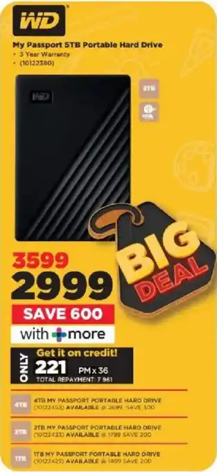 This special is available in various stores, view all products to get the cheapest WD My Passport 5TB Portable Hard Drive. If you'd like to find out whether this product has a bigger discount in another store, check the category 'Department Stores'. You may also find these specials interesting: My Passport 5TB Portable Hard Drive, Lexar External Hard Drive & Toshiba 2.5" 1TB USB 3.0 Hard Drive Canvio.