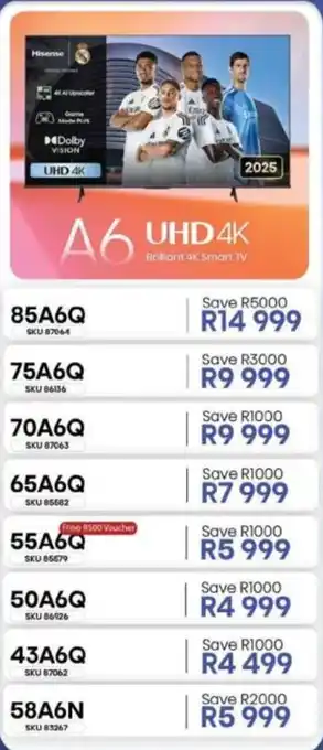 This special is available in various stores, view all products to get the cheapest Hisense 58" A6 UHD 4K TV. If you'd like to find out whether this product has a bigger discount in another store, check the category 'Electronics'. You may also find these specials interesting: Hisense 50 Smart 4K UHD TV 50A6Q (10304030), Hisense 50 4K UHD Smart TV 50A6Q (850035101) & Hisense 58 UHD Smart TV (58A6N).
