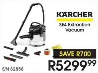 This special is available in various stores, view all products to get the cheapest Karcher SE4 Extraction Vacuum. If you'd like to find out whether this product has a bigger discount in another store, check the category 'Electronics'. You may also find these specials interesting: KARCHER Vacuum Cleaner, Karcher 3 Plus Vacuum Cleaner 665454 & Karcher White CVH2 Hand Vacuum.