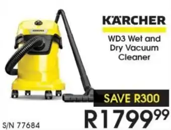 This special is available in various stores, view all products to get the cheapest Karcher WD3 Wet and Dry Vacuum Cleaner. If you'd like to find out whether this product has a bigger discount in another store, check the category 'Electronics'. You may also find these specials interesting: Karcher WD 4 Wet And Dry Vacuum Cleaner, Karcher Wet and dry Vacuum cleaner & Tough 15 Wet and Dry Vacuum Cleaner.