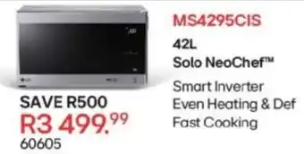 This special is available in various stores, view all products to get the cheapest LG Solo NeoChef Oven. If you'd like to find out whether this product has a bigger discount in another store, check the category 'Electronics'. You may also find these specials interesting: LG NeoChef Solo Microwave Oven, LG NeoChef Solo Microwave Oven & LG 56 L NeoChef Solo Microwave Oven (MS5696HIT).