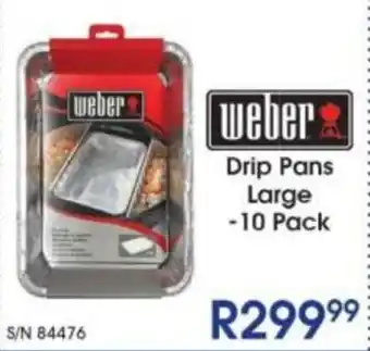 This special is available in various stores, view all products to get the cheapest Weber Drip Pans Large. If you'd like to find out whether this product has a bigger discount in another store, check the category 'Electronics'. You may also find these specials interesting: Universal Lids for Pots and Pans, DAY Universal Lids for Pots and Pans & Weber Briquettes.