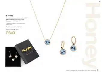 Honey Fashion Accessories offers a wide collection of products, besides the Honey 18ct gold plated stainless steel jewellery set. Keep an eye on the weekly Honey Fashion Accessories catalogue to find the best specials and promotions. Besides Honey 18ct gold plated stainless steel jewellery set, you can also find the following offers: Honey 18ct gold plated stainless steel jewellery set, Honey 18ct gold plated stainless steel jewellery set & Honey Stainless steel jewellery set.