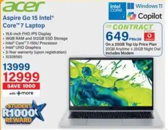 This special is available in various stores, view all products to get the cheapest Acer Aspire Go 15 Intel Core 7 Laptop. If you'd like to find out whether this product has a bigger discount in another store, check the category 'Electronics'. You may also find these specials interesting: Acer Aspire Go 15 Intel Core 5 Laptop, Acer Aspire Lite 14 Intel Core 3 Laptop & Acer Aspire Intel Core Ultra 7 155H Processor Laptop.