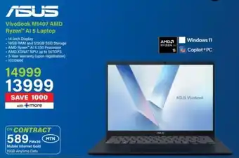 This special is available in various stores, view all products to get the cheapest ASUS VivoBook M1407 AMD Ryzen AI 5 Laptop. If you'd like to find out whether this product has a bigger discount in another store, check the category 'Electronics'. You may also find these specials interesting: ASUS VivoBook M1407 Ryzen AI 7 Laptop, ASUS Vivobook S14 AMD Ryzen AI 7 Laptop & ASUS Vivobook Go 15 AMD Ryzen 3 Laptop.