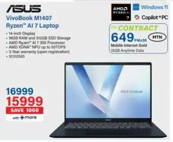 This special is available in various stores, view all products to get the cheapest ASUS VivoBook M1407 Ryzen AI 7 Laptop. If you'd like to find out whether this product has a bigger discount in another store, check the category 'Electronics'. You may also find these specials interesting: ASUS VivoBook M1407 AMD Ryzen AI 5 Laptop, ASUS Vivobook S14 AMD Ryzen AI 7 Laptop & ASUS Vivobook Go 15 AMD Ryzen 3 Laptop.