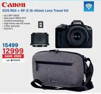 This Canon EOS R50 + RF-S 18-45mm Lens Travel Kit is currently part of a special promotion at Incredible Connection. All information regarding the current price, promotion terms, and validity period can be found on this page. You can also explore similar offers and promotions related to Canon EOS R50 + RF-S 18-45mm Lens Travel Kit, helping you make the best possible choice.
