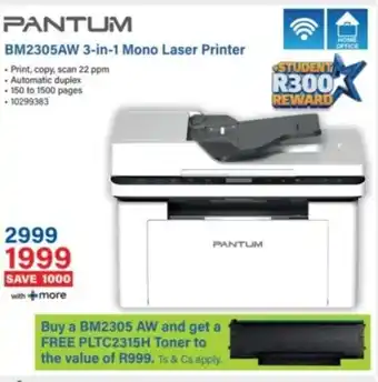 The price of Pantum BM2305AW 3-in-1 Mono Laser Printer can be found at the top of the page, together with the dates during which the special is available. You can also check the price in the current Incredible Connection catalogue or on the Incredible Connection website. Promotional offers assure you of buying Incredible Connection products at the lowest price.