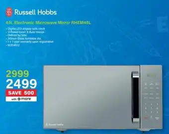This special is available in various stores, view all products to get the cheapest Russell Hobbs Electronic Microwave Mirror RHEM45L. If you'd like to find out whether this product has a bigger discount in another store, check the category 'Electronics'. You may also find these specials interesting: Russell Hobbs 36L Electronic Microwave Mirror RHEM36L, Russell Hobbs 30L Electronic Microwave RHEM31L & Russell Hobbs 60L Electronic Microwave RHEM60L.