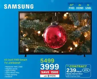 This special is available in various stores, view all products to get the cheapest Samsung 43-inch FHD Smart TV-43F6000F. If you'd like to find out whether this product has a bigger discount in another store, check the category 'Electronics'. You may also find these specials interesting: 32-inch FHD Smart TV-32H5000F, 40-inch Smart FHD TV-40A4Q & Samsung 32" FHD Smart TV.