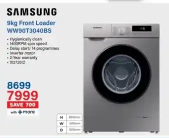 This special is available in various stores, view all products to get the cheapest Samsung Front Loader WW90T3040BS. If you'd like to find out whether this product has a bigger discount in another store, check the category 'Electronics'. You may also find these specials interesting: Samsung 9kg Front Loader WW90T3040BS, Samsung 11kg AI Front Loader WW11CGC04DABFA & Samsung 8 kg Front Loader Washing Machine (WW80T3040BS).