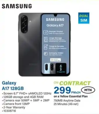 This special is available in various stores, view all products to get the cheapest Samsung Galaxy A17 128GB. If you'd like to find out whether this product has a bigger discount in another store, check the category 'Electronics'. You may also find these specials interesting: Samsung Galaxy A07, Samsung Galaxy A36 5G & Samsung Galaxy A36 128GB.