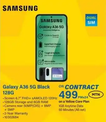 This special is available in various stores, view all products to get the cheapest Samsung Galaxy A36 5G Black 128G. If you'd like to find out whether this product has a bigger discount in another store, check the category 'Electronics'. You may also find these specials interesting: Samsung Galaxy A17 128GB Black, Samsung Galaxy A16 128GB Black & Samsung Galaxy A07 128GB Black.
