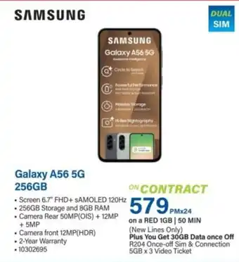 This Samsung Galaxy A56 5G 256GB is currently available as part of a special promotion at Incredible Connection. Be sure to check the current promotions filled with competitive prices and deals. You can order Samsung Galaxy A56 5G 256GB online via Incredible Connection website or get it at the best available price. Cataloguespecials.co.za collects the most relevant Samsung Galaxy A56 5G 256GB offers and specials for you. Want to be notified first? Click the bell icon to receive a free alert when the product is part of a new promotion or available again.