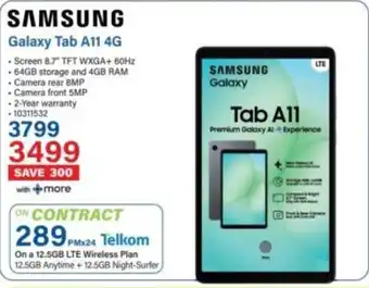 This special is available in various stores, view all products to get the cheapest Samsung Galaxy Tab A11 4G. If you'd like to find out whether this product has a bigger discount in another store, check the category 'Electronics'. You may also find these specials interesting: Samsung Galaxy Tab A11, Samsung Galaxy Tab A11 4G & SAMSUNG Galaxy Tab A11.